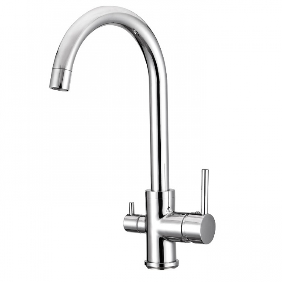 Baterie cu 3 cai coaxiala tip T2302A pentru montare pe chiuveta de bucatarie. pentru apa rece, calda si filtrata. Functiile asigurate sunt furnizare apa rece, apa calda si apa purificata/filtrata de la orice filtru de apa cum ar fi cele de tip EXCITO sau de la sistem de osmoza inversa, montat la chiuveta de bucatarie.
